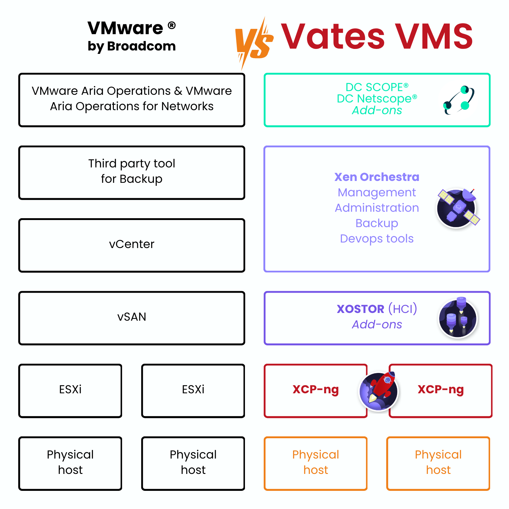 Vates VMS propose une alternative crédible, moderne et souveraine aux géants de la virtualisation. Grâce à ses produits phares – XCP-ng, une plateforme de virtualisation performante et robuste, et Xen Orchestra, une interface web tout-en-un, les utilisateurs retrouvent les fonctionnalités clés des solutions propriétaires sans les contraintes de licence ou de dépendance.